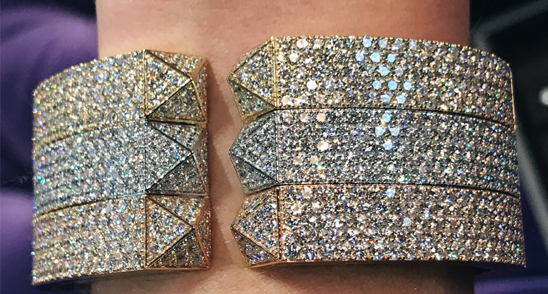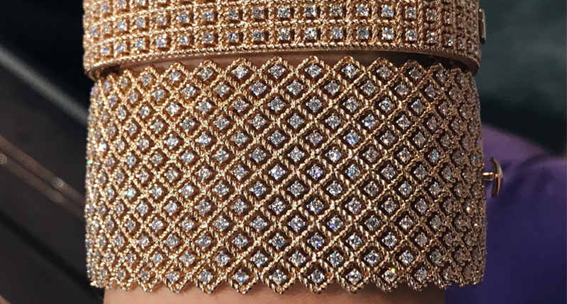 The elegant, structural collection, which also features accents of black jade and malachite, experimented with mixed metals in the form of a massive cuff comprised of 18-karat yellow, rose and white gold, pictured below. The effect of the multiple metals was surprisingly subtle underneath sparkling diamond pavé.