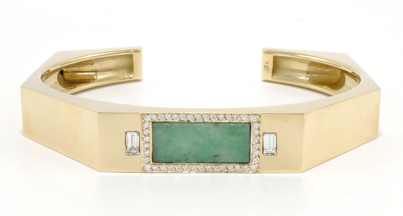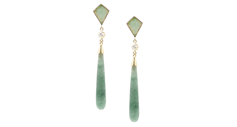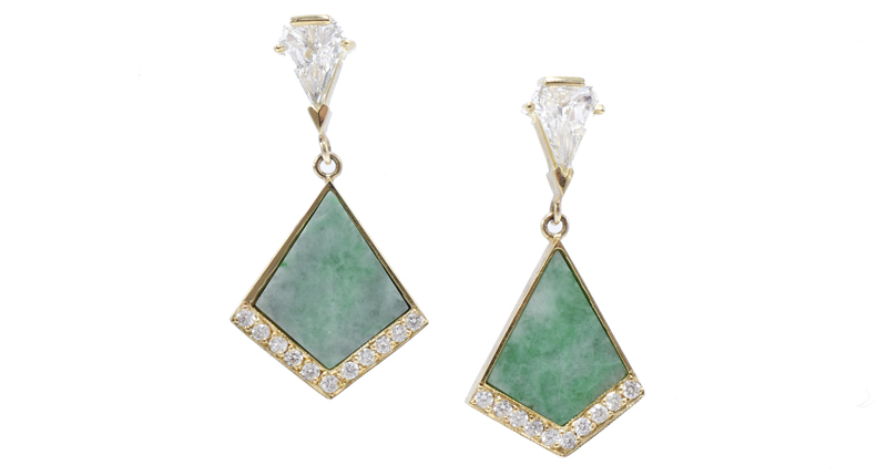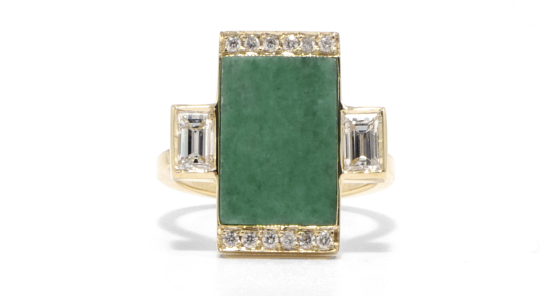 Zhang interpreted the geometric jadeite shapes in an Art Deco fashion, amplifying their bold angles with diamonds and 18-karat yellow gold.