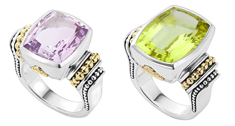 The line offers gemstones including Rose de France amethyst, white and Swiss blue topaz, amethyst and green quartz bezel-set into sterling silver bracelets, necklaces, earrings and rings, with Lagos’ signature “Caviar” beaded look and 18-karat yellow gold accents.