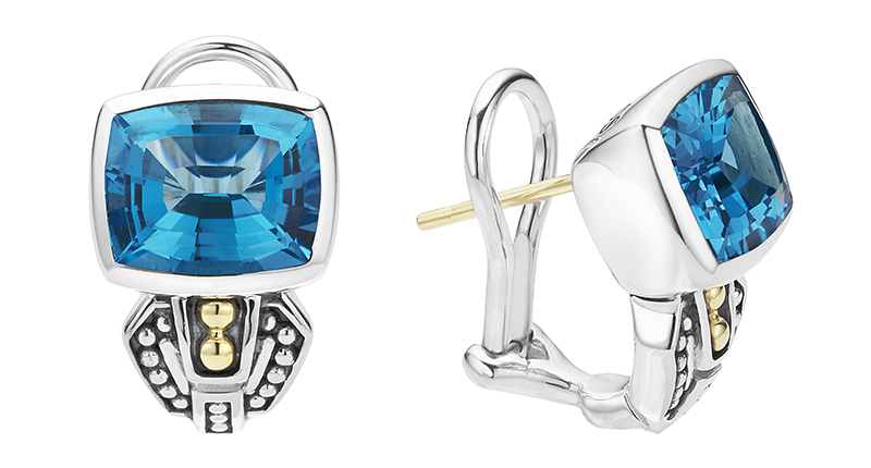 These Swiss blue topaz earrings are bezel set in sterling silver with 18-karat gold and silver Caviar beaded accents and 14-karat gold posts ($795).