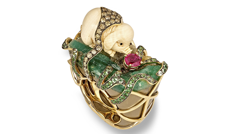 This glamorous representation features a pig crafted in white jet scouting for a ruby truffle on a rough emerald base. The style is rendered in 18-karat yellow gold and also features agate, tsavorite, and champagne diamonds. It retails for $11,250.