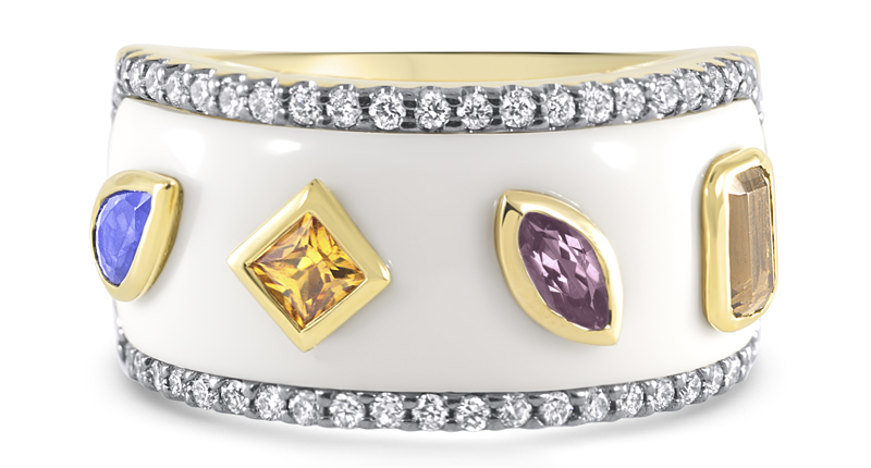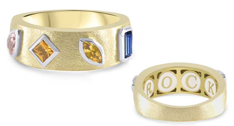 The first word Kedia created was “play,” represented by pink sapphire, lavender amethyst, amethyst and yellow beryl.