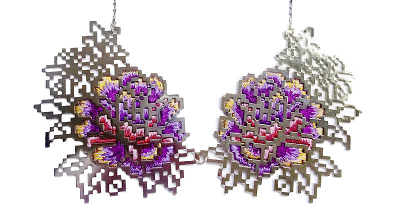 The exhibiting jewelers’ work only gets more conceptual from there. Taiwanese artist Heng Lee explores the intersection of nature and the digital world through jewelry that incorporates downloaded images, laser-cut metal and embroidery, while Scotland-based Wanshu Li incorporates ultraviolet-reactive nylon and fluorescent paint into her jewelry that provides a different effect when viewed beneath UV light.
