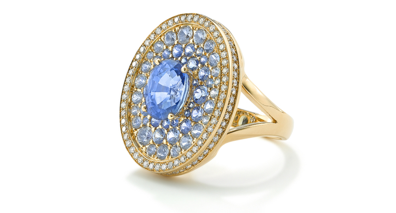 The latter look is on display in this aptly-named “Asteroid” ring, in which a bright, pastel-colored blue sapphire stands out in a sea of sapphires meticulously chosen to vary in shade for am ombre effect, surrounded with a double halo of white diamonds (as demonstrated in the picture below).