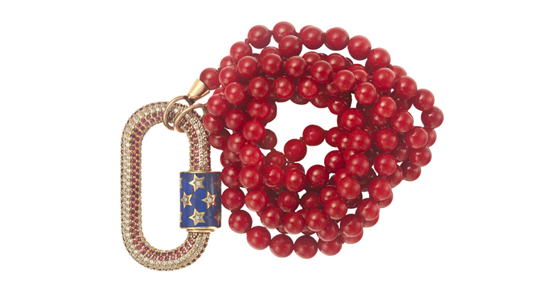 The 18-karat gold lock with lapis lazuli, cachalong, ruby and diamond, strung on a 36-inch undyed Mediterranean coral beaded necklace (pictured below), is available through inquiry on Aaron’s website. The lock is priced at $20,000 and necklace at $8,000.