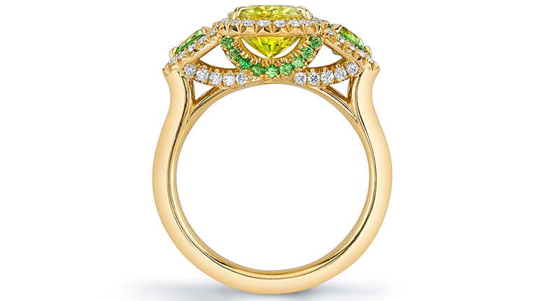 Spotted by our editors at this year’s JCK Luxury show, this 18-karat yellow gold ring features a 3.08-carat oval-shaped chrysoberyl accented by trillion-cut tsavorite (0.49 carats), round tsavorite (0.15 carats) and round diamonds (0.44 carats).