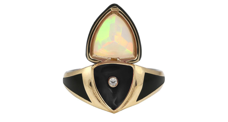 Like many Santo by Zani styles, this poison ring features striking enamel on 18-karat yellow gold. Lifting the opal top reveals a sweet diamond hidden inside, as seen below.