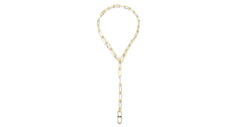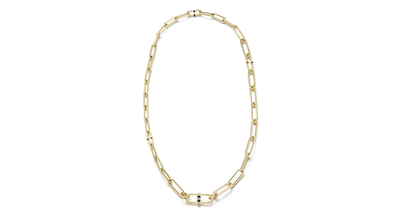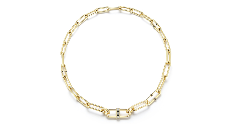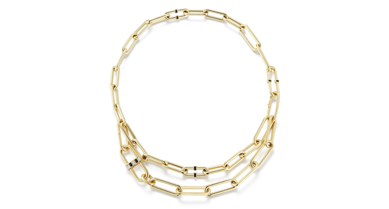 The versatile Interlocking Pill Link Necklace, rendered in 18-karat gold with diamonds and black enamel (though any variety of metal, enamel and gemstone is possible) offers five looks in one for $13,900, available via the designer’s website.