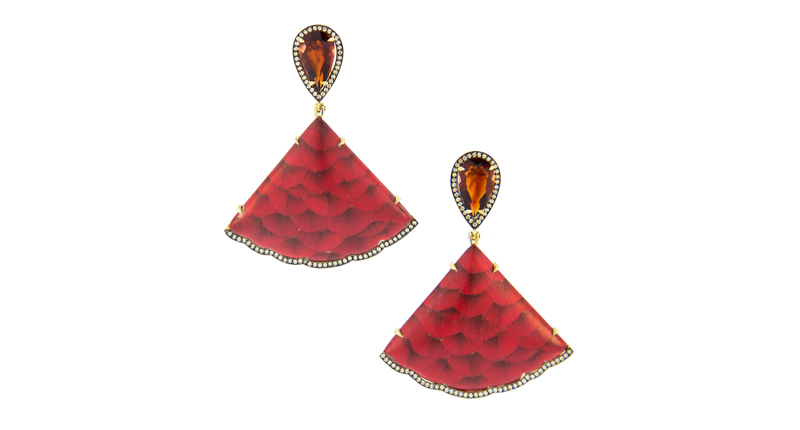 The below Muiparinga red wood earrings employ classic marquetry artisan-work to achieve their feather-like pattern.