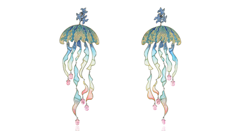 The below octopus earrings feature the most stunning shades of enamel for a delicious ombré effect that culminates in dangling pink sapphires. They’re the perfect addition to her trove of sea creatures.