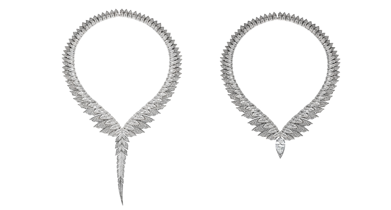 But of course, not only the up-and-comers can innovate. The inimitable Stephen Webster makes convertible jewelry as well. This breath-taking collar can be worn with a tail of diamond feathers or with a stunning, single solitaire.