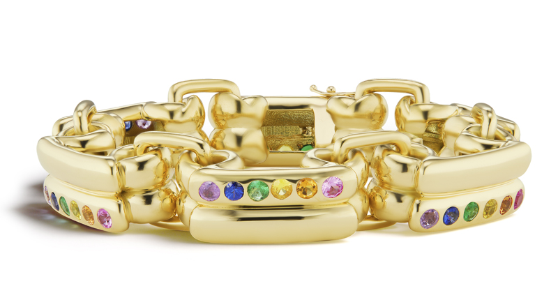 Vaguely nautical link bracelets, whether rendered in gold or set with diamonds or multicolored sapphires, are destined to become Brent Neale classics, as are bangle and cuff additions to the line’s “Gypsy” series, in which gemstones are flush-set in the bold gold styles.
