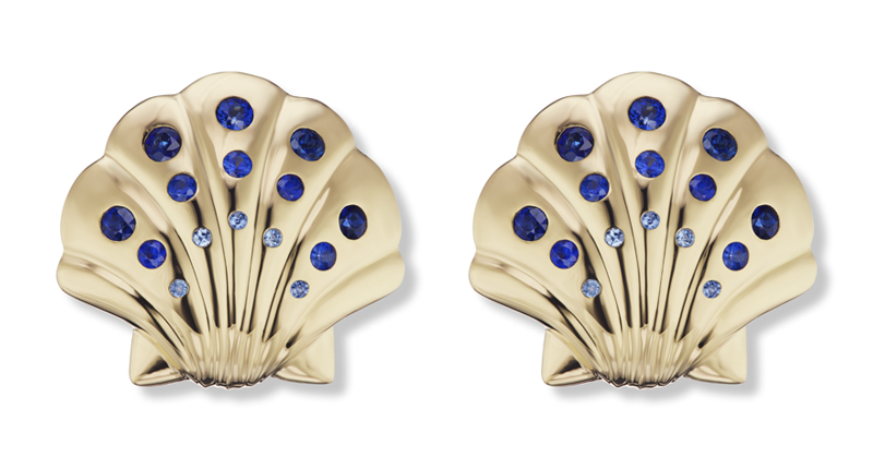 In the Splash collection, this translates to a new clamshell motif, seen in a ring that hinges open to reveal a pearl, stud earrings with flush-set sapphires and pendants with gemstones like lapis lazuli and malachite custom-carved to resemble the shell’s shape.