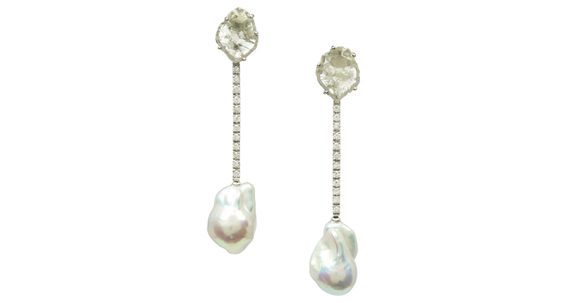 Elyria Jewels’ “Rumi Earrings No. 1” feature diamond slices and baroque freshwater pearls in 18-karat white gold ($9,800). ElyriaJewels.com