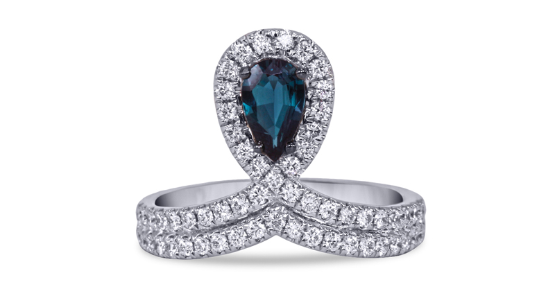 Mark Henry’s alexandrite and diamond cocktail ring with a 0.51-carat pear-shaped alexandrite center and diamond accents set in 18-karat white gold ($12,400). MarkHenryJewelry.com