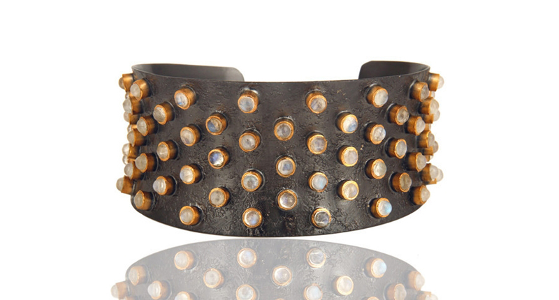 Geoffrey Scott’s “Melrose” cuff features rainbow moonstones set in oxidized sterling silver and 22-karat gold vermeil ($2,550). GeoffreyScott.com
