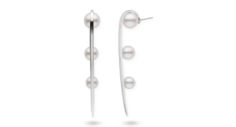 These are Pearl Collective’s long curved spike pearl earrings with white freshwater pearls in sterling silver ($525). PearlCollective.com