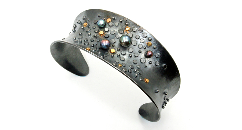 Sydney Lynch’s “Tide Pool” cuff featuring 18-karat gold and oxidized silver with dyed black pearls ($880) SydneyLynch.com