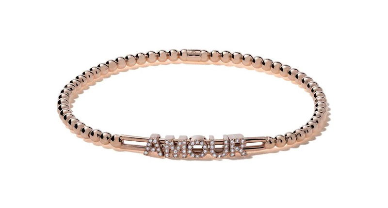 Crafted in 18-karat gold with diamonds, highlights include diamond bracelets with a heart and padlock or letters spelling “Amour,” and a ring with dangling diamond pave heart.