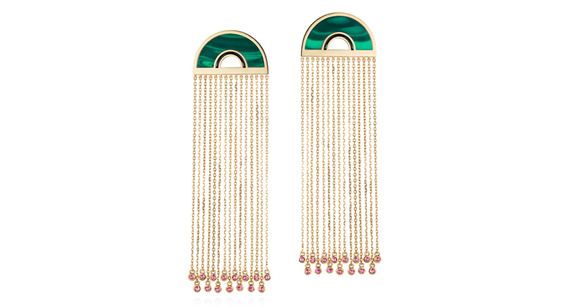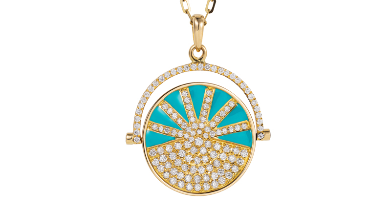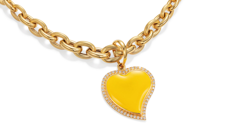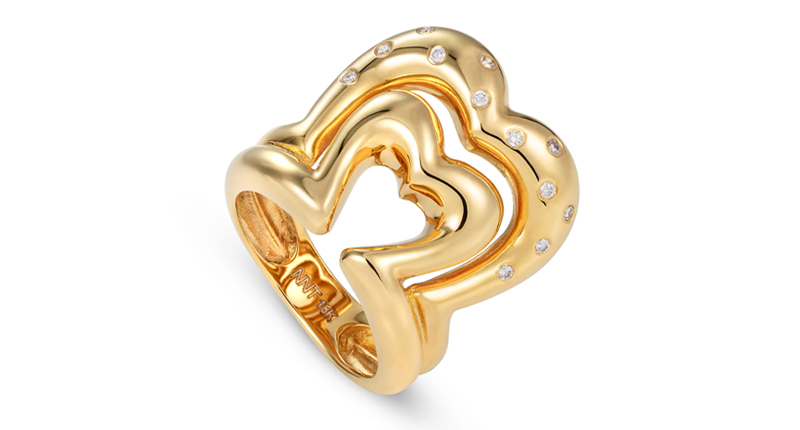 Of the heart motif so prevalent in the fine jewelry market in the past year, NeverNoT crafts a particularly effective and original take: a bursting double outline that’s a wearable statement ring, available in gold or neon green or pink enamel, or a new curving pendant in similarly vivid shades.
