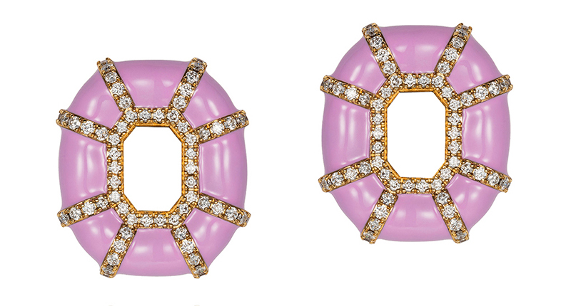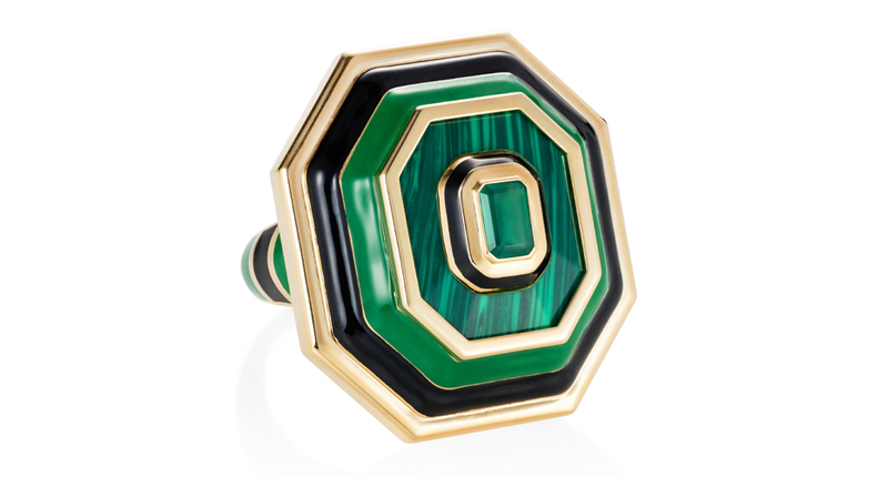 A signature style is an oversized cocktail ring shaped like an emerald-cut gemstone but crafted in 18-karat gold and turquoise, yellow, pink and black and white striped enamel.