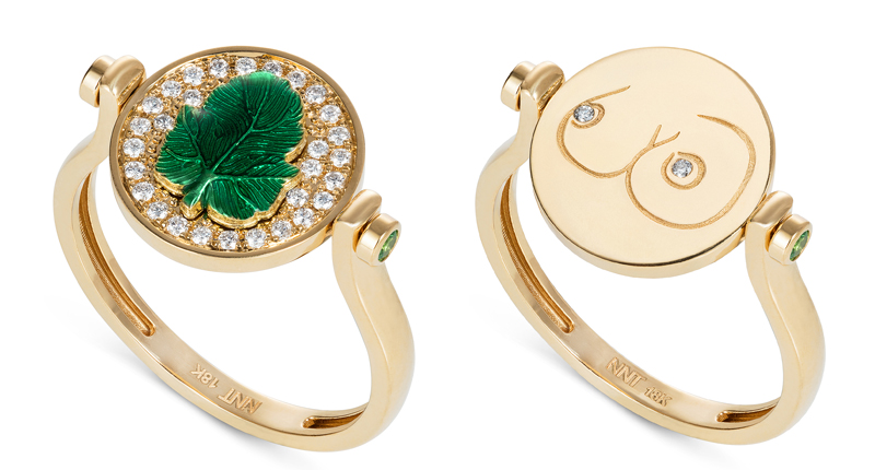 In addition to fringe earrings and cocktail rings, NeverNoT’s most mature but no less amusing collection is its tongue-in-cheek nod to censorship—the fig leaf.