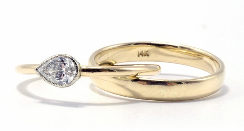 This pear-cut stone packs a lot of punch for a mere 0.3-carat G/H color, VS clarity diamond. The bezel-set stone adorns a thin 14-karat yellow gold band, interlinked with a heftier band in the same metal.