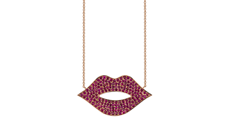 Sydney Evan’s “Large Lips” necklace features pave rubies set in 14-karat rose gold ($3,125).
