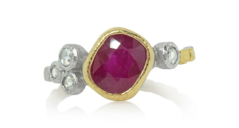 The “Skinny Pebbles” ring from Rona Fisher featuring a cushion-cut ruby and rose-cut diamonds is made with 18-karat gold and palladium ($3,250).