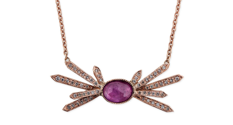 This is Jacquie Aiche’s “Ruby Icepick Cluster” necklace, featuring an oval ruby accented with pave diamonds and set in 14-karat rose gold ($4,375).