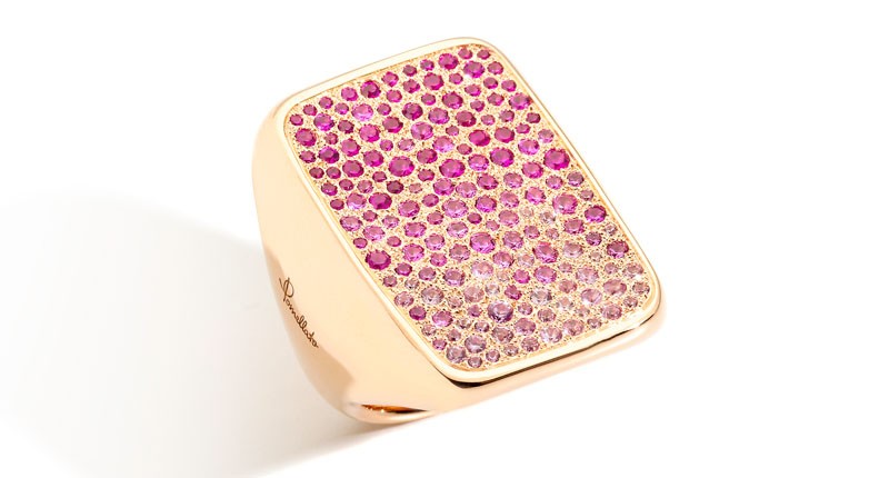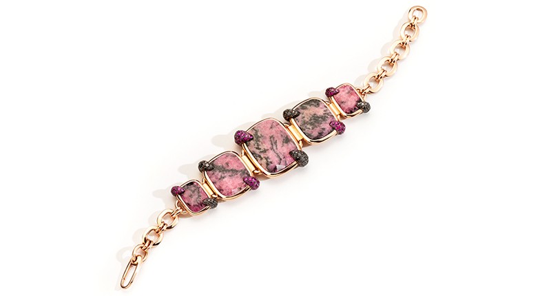 Pomellato also celebrates colored stone pave with Pavé Sabbia; hardstones like rhodonite, amazonite and malachite through the Mineralismo jewels; and specific color groupings with three sets of rich, lush Rivière jewels.