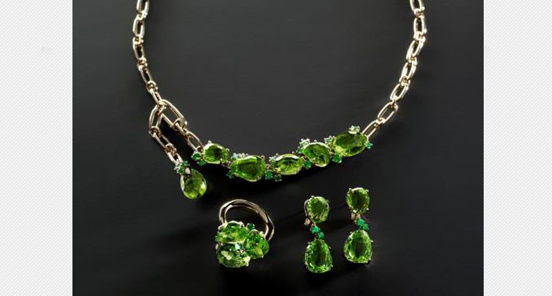 One version of the Nudo Cascade, for example, pairs peridot and white topaz, with these cascading stones accented with tsavorite garnets and gold.