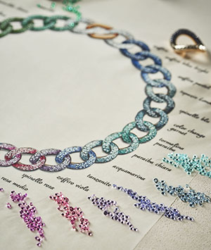 Inspired by its well-known Nudo designs, the new Nudo necklaces in La Gioia feature gemstones cut with the “Clessidra” style (Italian for hourglass)—the double-sided cut places 57 facets on the top and bottom of the gems.