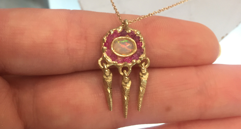 Her dream-catcher necklace and earrings, in which opals were surrounded with rubies and framed with dangling pieces of gold instead of feathers, were my favorite of all of her pieces.