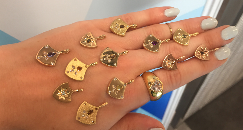 Solomon isn’t a newcomer, but this was her first venture into the trade show world. What I like about seeing her pieces in person is that it becomes obvious how the rough, primitive quality of her handmade jewelry is so deliberate, referencing her Native American influences. The aesthetic has a childlike innocence, which is echoed in the themes of her work: peace, love and happiness-- essentially everything the world could use a little more of today.