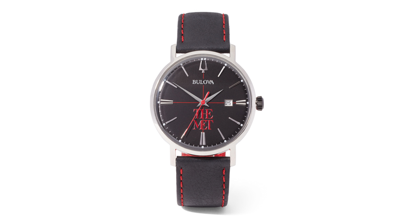 One of Bulova’s “Classic Aerojet” styles, it has a silver-tone crown and accents and a black dial. It features a three-hand calendar function, box mineral glass and a black leather strap with contrast red stitching—a colorful nod to The Met’s signature hue. It sells for $295.