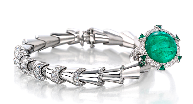 Stand-out items include a cat’s eye moonstone necklace priced at $160,000, an Art Deco-inspired Paraiba tourmaline and diamond bracelet valued at $330,000, and a 5.98-carat sphene ring priced at $28,000.