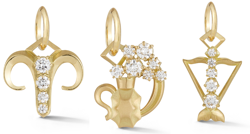 Zodiac charms retail for $1,990, and their stud earring counterparts, sold as pairs, for $1,850. Alphabet charms sell for $1,450, the evil eye charm for $1,650 and the cross charm for $1,800.