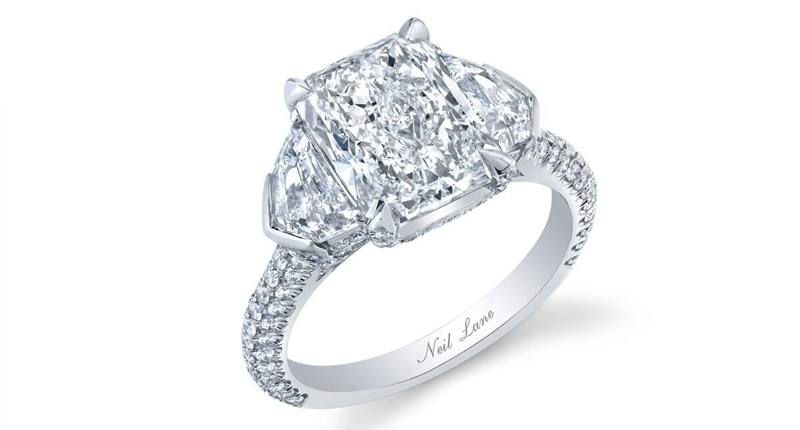 The resulting engagement ring was a three-stone style with a radiant diamond center stone framed by shield-cut diamonds, set in platinum and on a band featuring 145 round diamonds.