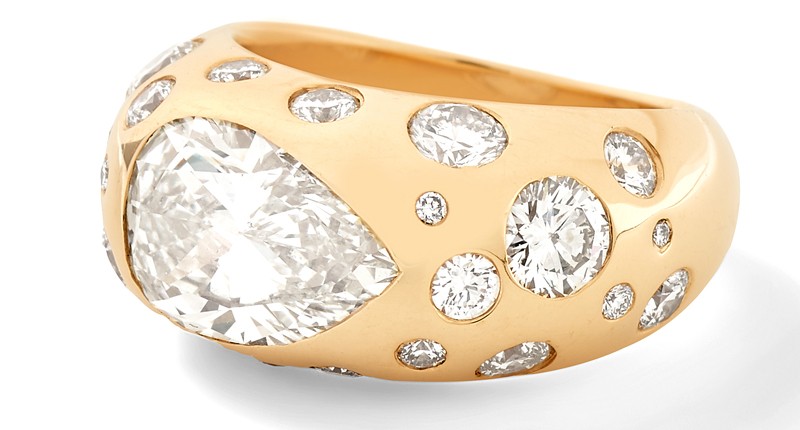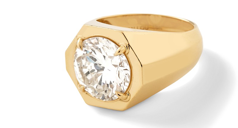 The designer’s answer to brides’ demand for heavy gold styles is “Babs,” a thick gold band featuring an east-west flush-set pear diamond center stone surrounded by a scattering of flush-set round diamonds, and the “Monet,” a prong-set round diamond on a thick, octahedral, signet-style band.