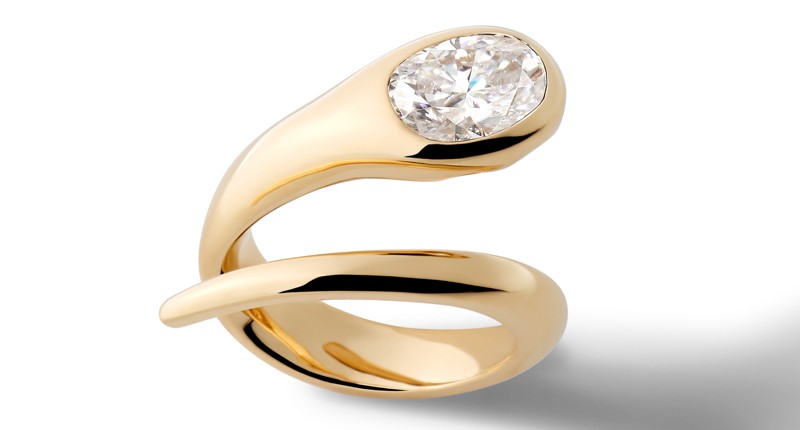 A curving open ring featuring an oval-cut diamond, the “Beth,” is reminiscent of a vintage snake style, and boasts all that metal clients are asking for.