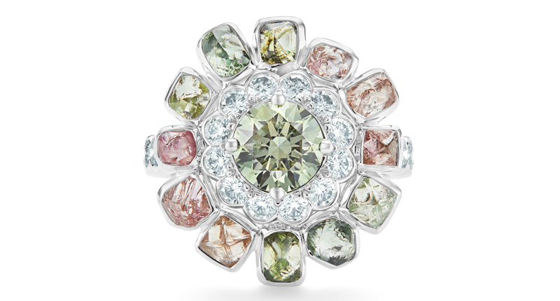 The assortment’s hero piece is the above 5.44 carat total weight diamond ring with rare, 1.01-carat, fancy dark grayish green diamond center stone. It’s surrounded by round brilliant white diamonds, as well as 12 bezel-set green and pink rough diamonds. Round brilliant white diamonds also feature on the ring’s shank. The ring’s scalloped edges are meant to evoke the Okavanga Delta’s organic beauty.