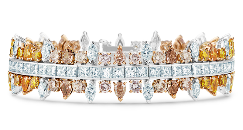 The below bracelet, featuring 158 diamonds weighing a total 26.98 carats and displaying a range of colors and shapes is a particularly stunning piece, exemplifies the set’s dichotomy of hard and soft.