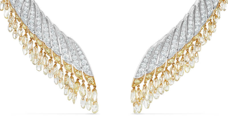 The set features a new design element for De Beers, rough diamonds with cap settings, to create a fringe effect, as seen in the below collar.