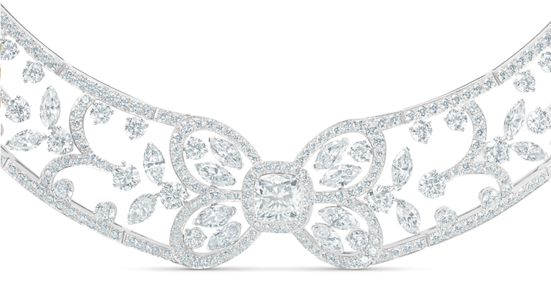 The pièce de résistance is the below collar, featuring 932 diamonds, a 2.18-carat cushion-cut diamond at its center.