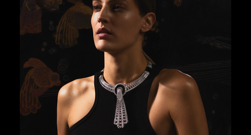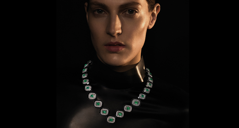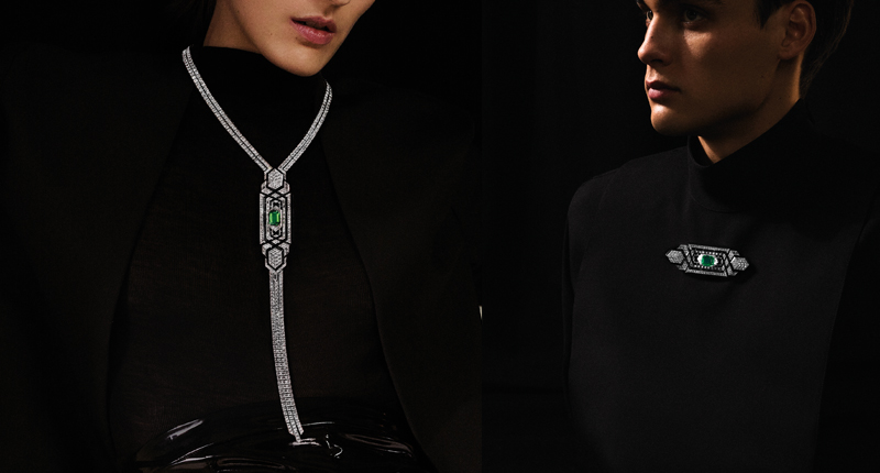 Translating this current evolution into a high jewelry collection, Boucheron created a long white gold necklace inspired by a tie, with a detachable brooch featuring an 8.02-carat emerald with onyx and black lacquer. The piece is meant to be worn by either gender, as a tie, necklace, pendant or brooch.
