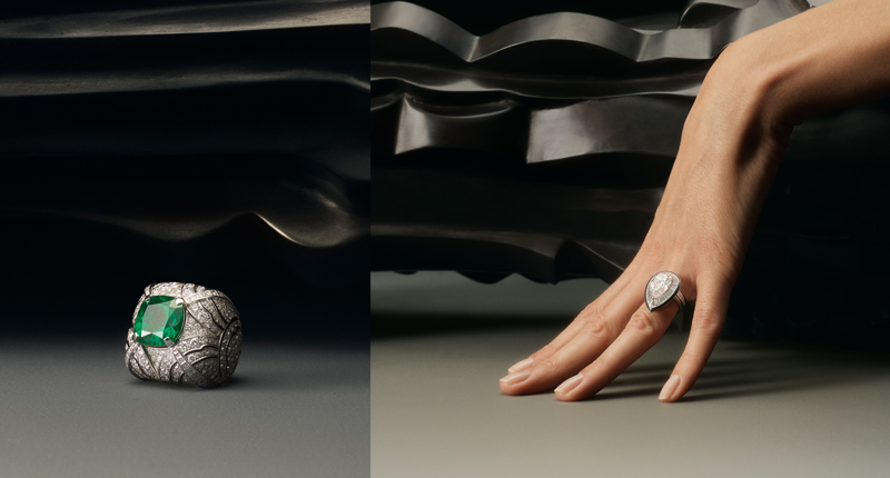 Convertible and Art Deco are the themes throughout the collection, which features emeralds as pops of color against a white gold, white diamond and black onyx and lacquer backdrop.