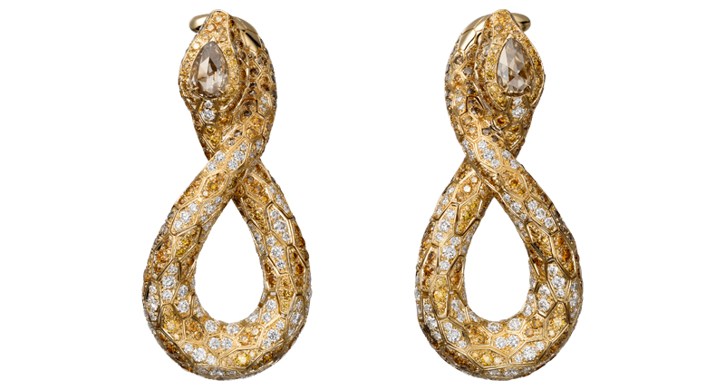 She took advantage of her multiple ear piercings, wearing two identical white gold and diamond Serpenti Viper earrings.