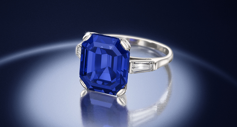 Following this piece is a Kashmir sapphire single-stone ring of 9.61 carats. The octagonal step-cut sapphire has no indications of heating, Bonhams said, and is estimated to sell for between $642,000 and $899,000.