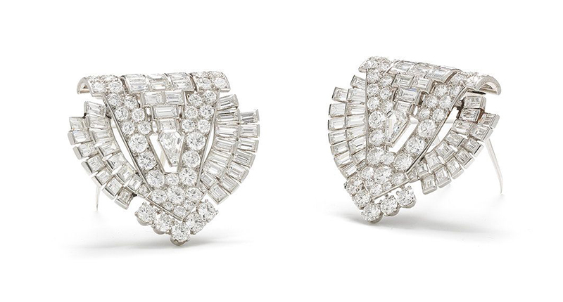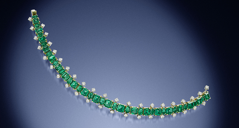 This includes a pair of Art Deco diamond clip brooches circa 1935, estimated at between $51,300 and $77,000, and, adding more color to the sale, an emerald and diamond bracelet by Cartier. It features a series of alternating step- and octagonal-cut emeralds, accented on both sides by brilliant-cut diamonds, and has a pre-sale estimate of $64,200 to $89,900.
